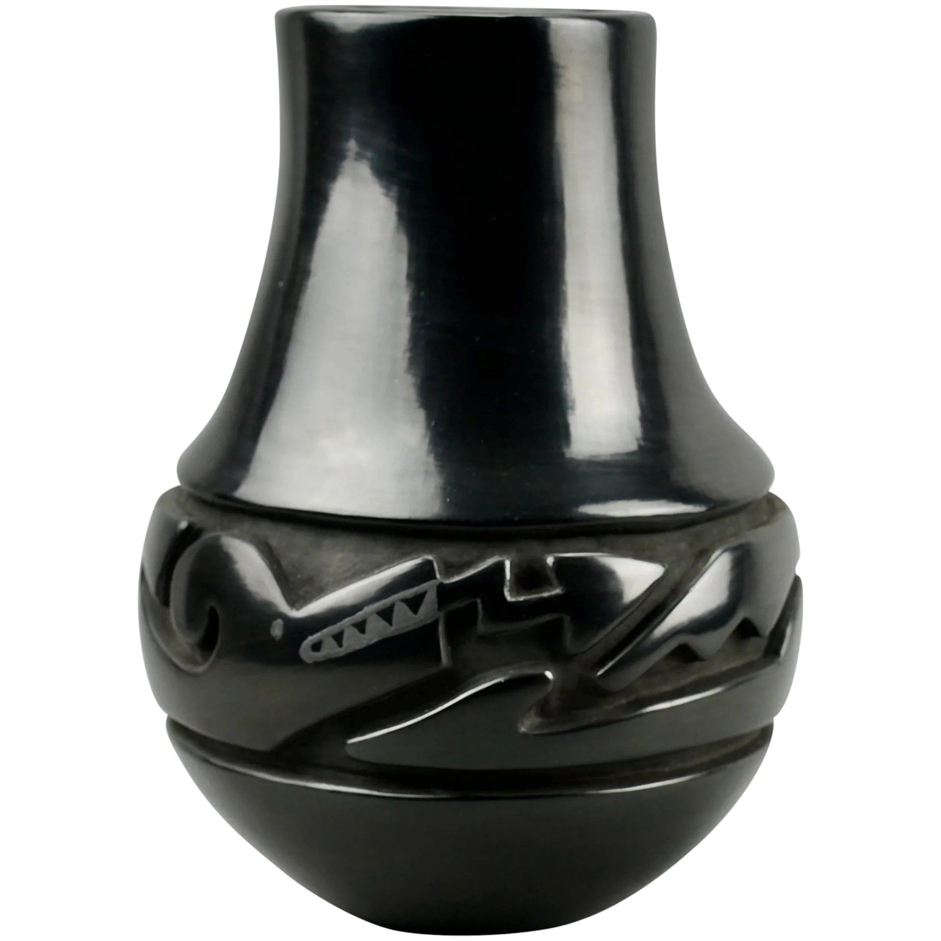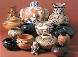 Maria Martinez, San Ildefonso Pueblo, made the black on black pottery famous at the Saint Louis World's Fair as well as the whole world of Pueblo pottery. Santa Clara Pueblo and San Ildefonso Pueblo primarily are the black on black pottery makers.