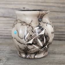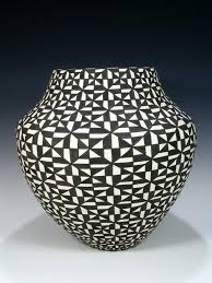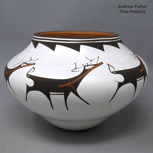 Acoma Pueblo pottery use a white base with black and brown/tan colors. They use detailed geometric designs and some animal designs. Acoma pottery is very distinctive and adds to any Southwest home decor.